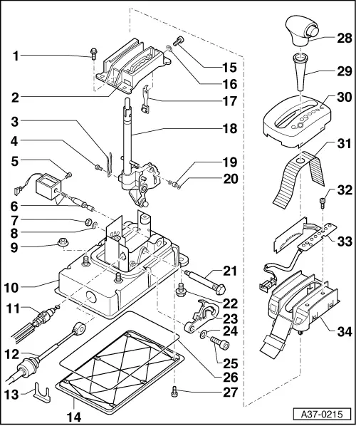 | q | To remove, push sleeve for selector lever -item 29- downwards and remove handle by pulling it upwards |