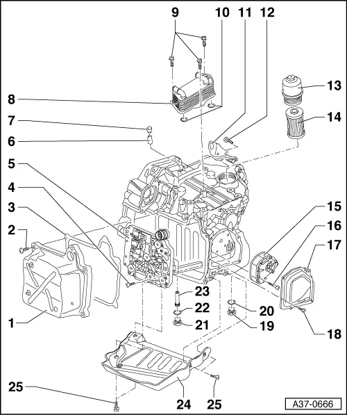 Note| -Items 1 … 7, 15 … 18, 24, 25- can be disregarded here. For description see → Chapter „Exploded view - oil pan, mechatronic unit, gear oil pump“. |