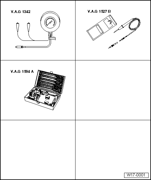 | Connect voltage tester -V.A.G 1527 B- with test leads from auxiliary measuring set -V.A.G 1594 C- to battery positive (+) and to oil pressure switch -B-. LED must not light up. |