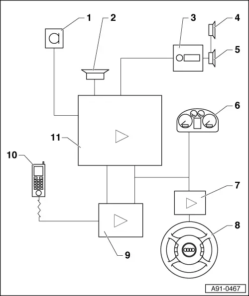 | 9 - | Telephone/telematics control unit -J526- in electronics box beneath front seat (right-side) |