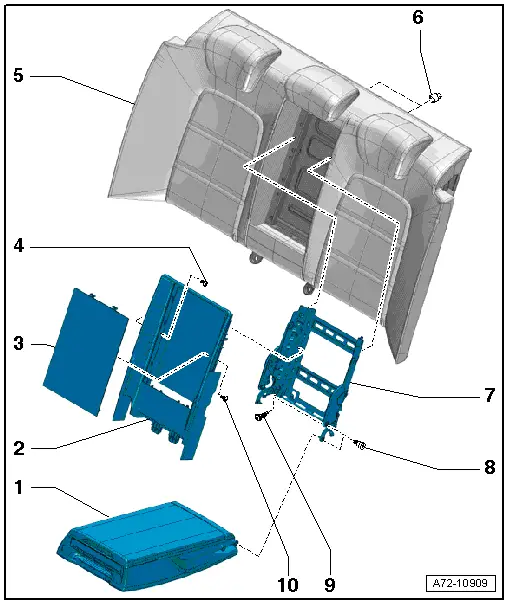 | Exploded view of centre armrest and cover for backrest bracket with trim for backrest bracket (fixed rear seat backrest) |