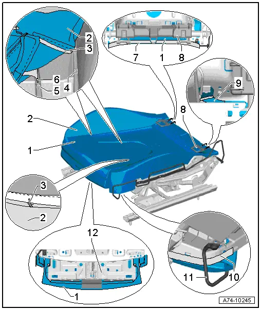 | Exploded view of seat cover and padding (seat pan with seat depth adjustment) |