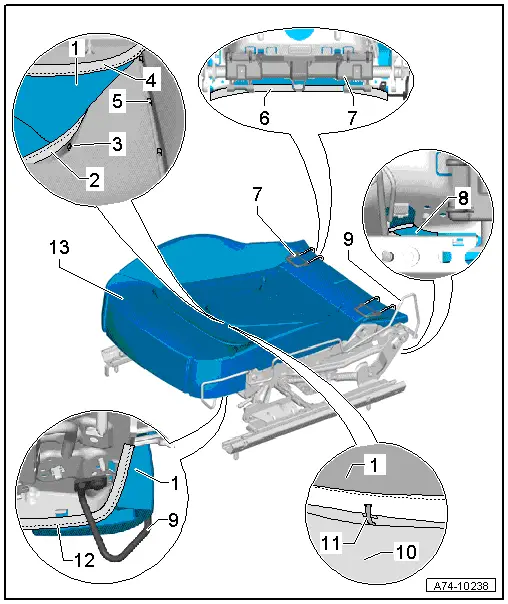 | Exploded view of seat cover and padding (seat pan without seat depth adjustment) |