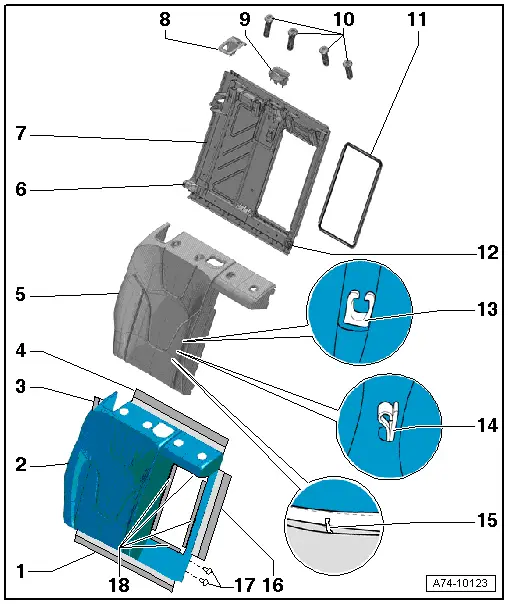 | Exploded view of cover and padding for split rear seat backrest (with load-through hatch) |