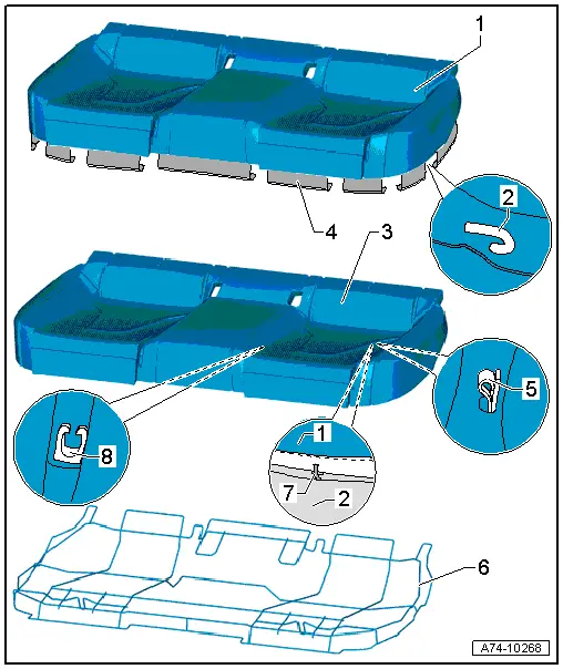 | Exploded view of seat cover and padding (seat bench without centre storage compartment) |