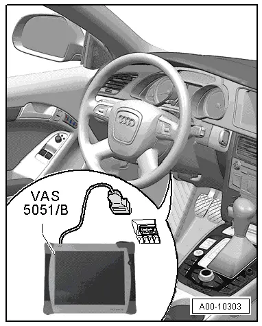 | With ignition switched off, connect vehicle diagnostic, testing and information system -VAS 5051B- or -VAS 5052- to 16-pin diagnostic connector in vehicle. |