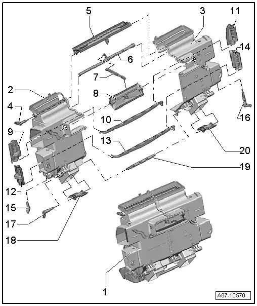 Note| Air conditioning units with an air distribution housing with optimised air routing were gradually introduced as of 08.2007 (types „1“ and „2“) → Chapter |