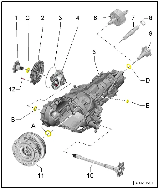 | The oil seals -C-, -D- and -E- can be renewed with the gearbox installed in the vehicle. |