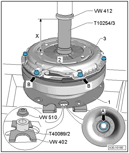 | – | Position the clutch module so that the thrust pad -VW 510- makes contact with the bearing washer -arrow A- in the dual-mass flywheel. |