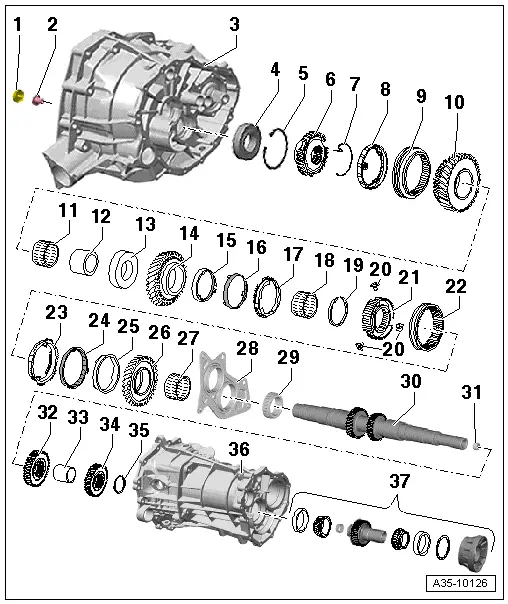 Note| t | Refer to technical data when installing new gears or a new output shaft → 6-speed manual gearbox 0B2, four-wheel drive; Rep. Gr.00. |