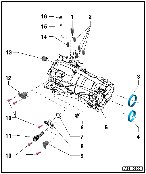 | q | Only installed in gearboxes with sealing cap/selector shaft in conjunction with gearbox neutral position sender -G701- or sealing plug |