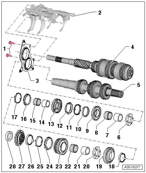 | q | Removing and installing 1st, 2nd and reverse gear → Chapter |