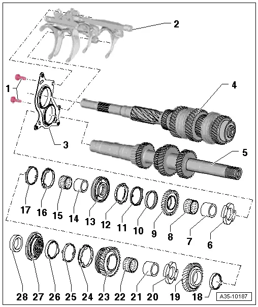 | q | Removing and installing 1st, 2nd and reverse gear → Chapter |