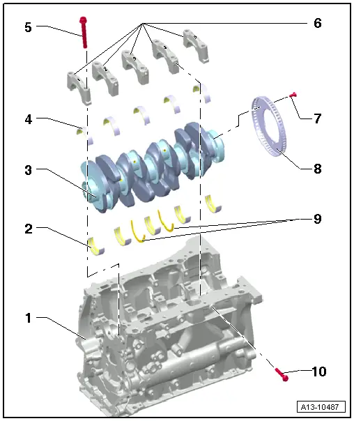 | q | If crankshaft is renewed, new bearing shells must be assigned to bearing caps → Chapter |