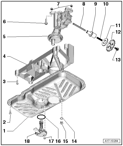 | q | If bolt cannot be tightened to torque, remove sump (bottom section) with baffle plate and counterhold oil pump drive shaft using an open-end spanner. |