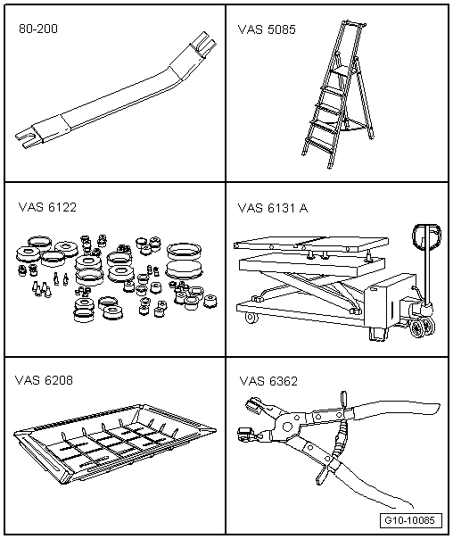 | t | Scissor-type assembly platform -VAS 6131 A- with support set for Audi -VAS 6131/10- and supplementary set -VAS 6131/13- |