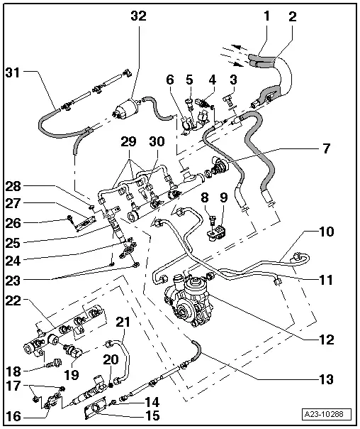 | q | After renewing high-pressure pump or fuel pressure regulating valve -N276-, learnt values must be re-adapted; see „Guided Functions“ in vehicle diagnostic tester |