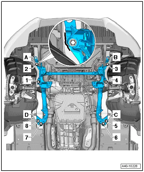 | Press subframe into place at markings -C- and -D-. Tighten bolts -5- and -8- to specified torque. |