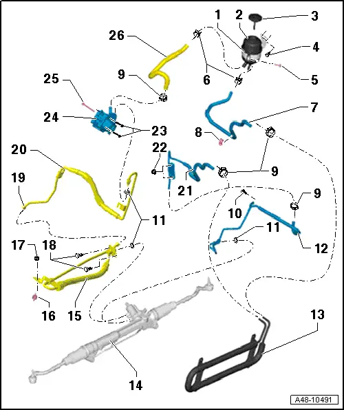 | t | The power steering pump is supplied without fluid filling. Prior to installation, the pump must therefore always be filled with hydraulic fluid and turned by hand. Otherwise, there is a possibility of pump damage or noise while driving. |