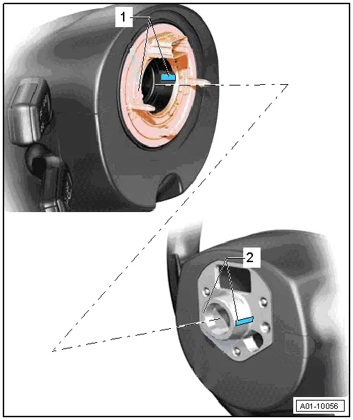 | The tolerances are minimised further by using a woodruff key to position the switch module with the steering column electronics control unit -J527- on the crash tube. The centre point of the steering is specified at the factory by markings on the steering wheel hub and steering tube. |