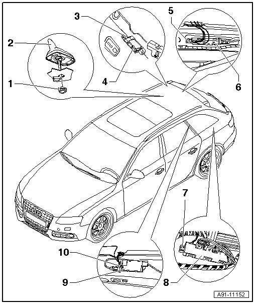 | 9 - | Aerial amplifier 3 -R112- (CAN radio/MMI from week 45/08 onwards) |