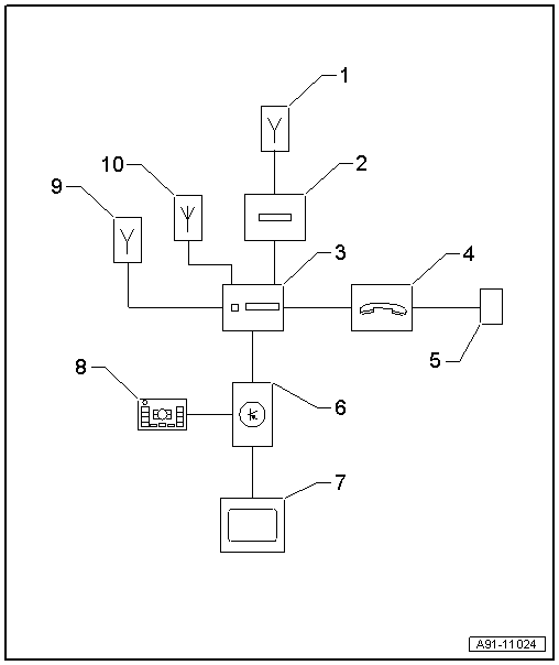 | 5 - | Connector cable for mobile telephone -R54- in centre console storage compartment |