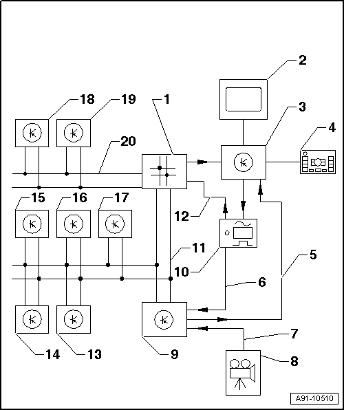 | 9 - | Reversing camera system control unit -J772- behind luggage compartment side trim (right-side) |