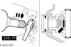 CAUTION:The inner joint must not be bent at more than 18°, the outer at more than 45°. CAUTION:When installing the front drive shafts, use the locating sleeve (supplied with each new oil seal) to protect the oil seal. NOTE:Make sure the circlip engages correctly. Install the left-hand front driveshaft with a new circlip into the transmission. | | | -