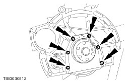 NOTE:Install new flywheel retaining bolts. Using the special tool, install the flywheel. - Tighten the bolts in the sequence shown in two stages.