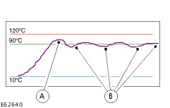 The IAT sensor output is useful if the engine being tested is cold or after an over-night cold soak. The ECT sensor or CHT sensor and the IAT sensor should either indicate the same value or be within 1 to 2 degrees Celsius of each other. The ECT sensor output is important to display as it indicates the engine warm-up and opening temperature for the thermostat. It will initially indicate a slightly higher reading just before the thermostat opens and then drops back before settling to a near flat line output (see graphic below). B - Thermostat settles into a cyclic open and closure pattern CAUTION:If the ECT sensor output reaches the 120ºC default line under normal cooling system pressure, internal damage may be caused to the engine and a diagnostic trouble code (DTC) will be set in the PCM. The test should be stopped and the cause located and corrected. If the cooling system does not pressurize, the coolant will boil at 100ºC which may also damage the engine. CARRY OUT the Coolant Expansion Tank Cap Pressure Test Component Test in this section. If the Ford approved diagnostic tool only allows the ECT sensor to be displayed in volts, refer to the following table for corresponding Celsius values: | Volts | ºCelsius | | 1.33 | 60 | | 1.02 | 70 | | 0.78 | 80 | | 0.60 | 90 | | 0.46 | 100 | | 0.35 | 110 | | 0.27 | 120 | The CHT sensor output is useful to examine the cylinder head temperature rise during the warm-up cycle and later during the normal light throttle cruise test. This sensor output may vary between vehicles with manual transmission and vehicles with automatic transmission and should be used for reference only. The LOAD display is used for reference as it is necessary to maintain a stable load line during the test. It is necessary to carry out the test under normal light throttle cruise driving conditions and average loads, typically 40% to 70% of the load value. The VSS output is used for reference but can help to identify misfires and sensors which fail during the warm-up cycle. The RPM display indicates the engine speed and can be compared with the DSRPM. The DSRPM is the desired or calculated idle speed which the PCM commands the engine to reach. If the thermostat opens too early (before the correct opening temperature has been reached), the engine will not reach this value. When using the Ford approved diagnostic tool in datalogger mode, the signals recorded should remain within the DEFAULT values set by the Ford approved diagnostic tool. -