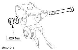 CAUTION:Lubricate the shaft of the special tool with White grease. Using the special tools, remove the beam axle bushing on both sides. | Installation NOTE:Final tightening of the rear suspension components must be carried out when the vehicle weight is on the road wheels. | | -