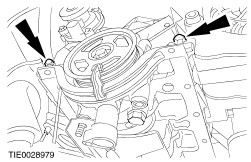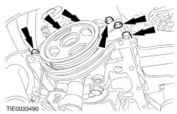 CAUTION:Only remove the oil pump together with the crankshaft pulley. CAUTION:Do not remove the crankshaft pulley from the oil pump after oil pump assembly removal. Remove the oil pump assembly. - Discard the pre-sealed oil pump retaining bolts.