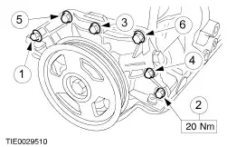NOTE:Install new pre-sealed bolts in position 1 and 3. Tighten the oil pump retaining bolts (engine shown removed for clarity). - Tighten the bolts in the sequence shown.