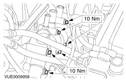 Using the special tool, disconnect the coolant hoses from the thermostat housing. | | | -