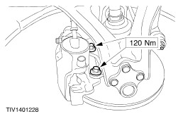 CAUTION:Suspend the brake caliper and anchor plate to prevent load being placed on the brake hose. Detach the brake caliper and anchor plate assembly from the wheel knuckle. | | | -