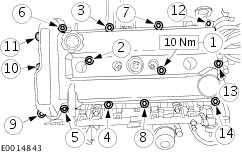NOTE:Install a new valve cover gasket if necessary. Install the valve cover. - Tighten the bolts in the sequence shown.