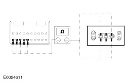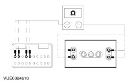 | | | Are the resistances greater than 10,000 ohms (open circuit)? Yes INSTALL a new audio unit. TEST the system for normal operation. No REPAIR the circuit in question. TEST the system for normal operation. | | PINPOINT TEST E : NO SOUND FROM ONE OR MORE OF THE SPEAKERS (NOT ALL SPEAKERS) | | TEST CONDITIONS | DETAILS/RESULTS/ACTIONS | | E1: CHECK THE SPEAKER RESISTANCE | | | 1 Disconnect Inoperative Speaker. | | | 2 Measure the resistance between the inoperative speaker pin 1 and pin 2, component side. | | | Is the resistance approximately 4.0 ohms? Yes No INSTALL a new speaker(s). TEST the system for normal operation. | | E2: CHECK SPEAKER CIRCUIT RESISTANCE - SPEAKER DISCONNECTED | | | 1 Disconnect Audio Unit C484. | | | 2 Measure the resistance between the audio unit C484 and the speaker connector pins for the inoperative speaker(s). - (Front left speaker) C484 pin 1, circuit 8-MD10 (WH/BK), harness side and C720 pin 2, circuit 8-MD28 (WH), harness side.