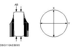 Measure the journal diameters in the X and Y directions at the two points (A and B) as shown in the figure. Replace the balance shaft if necessary. - Standard diameter Front: 41.945—41.960 mm {1.6514—1.6519 in}.