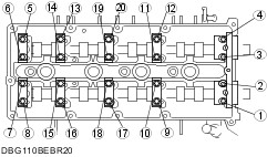 CAUTION:Because there is little camshaft thrust clearance, the camshaft must be held horizontally while it is installed. Otherwise, excessive force will be applied to the thrust area, causing burr on the thrust receiving area of the cylinder head journal. To avoid this, the following procedure must be observed. Tighten the camshaft cap bolts gradually in three or four steps in the order shown. | | | -