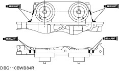 Apply silicone sealant to the cylinder block as shown. - Thickness ø2.0—3.0 mm {0.08—0.11 in}.
