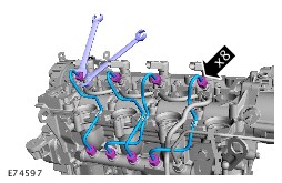 Clean the fuel injectors, fuel rail, high-pressure fuel supply lines and surrounding areas. Refer to: Fuel Injection Component Cleaning (303-04D, General Procedures). | | | -
