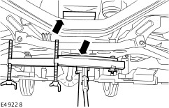 Using a suitable transmission jack, lower the front axle crossmember. - Insert 80 mm wooden blocks.