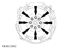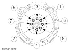 NOTE:Install new flywheel bolts. Install the flywheel. - Tighten the bolts in the sequence shown in three stages.
