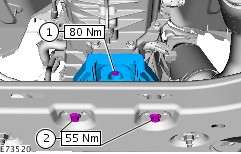 CAUTION:Install new bolts. NOTE:Ensure that the centre bearing bracket is square to the centre line of the driveshaft tube forward of the bracket and the rubber is not distorted. Tighten the driveshaft front center bearing retaining bolts. | | | -