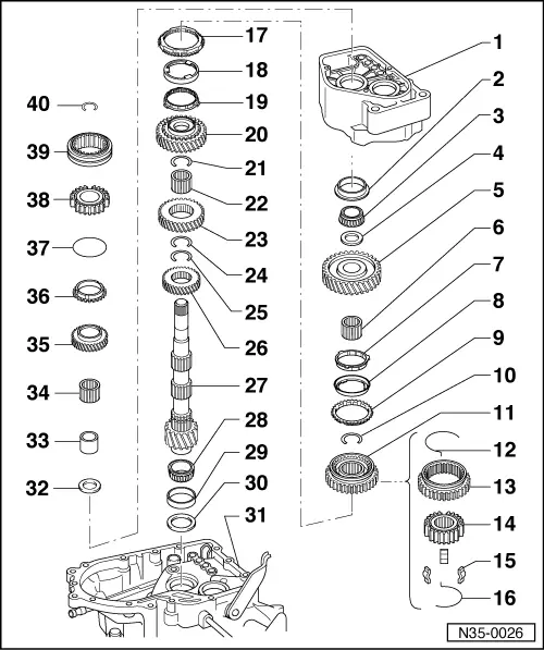 Note!| t | Whenever new gears or a new layshaft are fitted consult the technical data → Chapter, Code letters, group numbers, ratios, filling quantities |