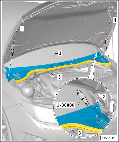| – | Remove the rubber seal -2- of the grille under the windscreen -3-. |