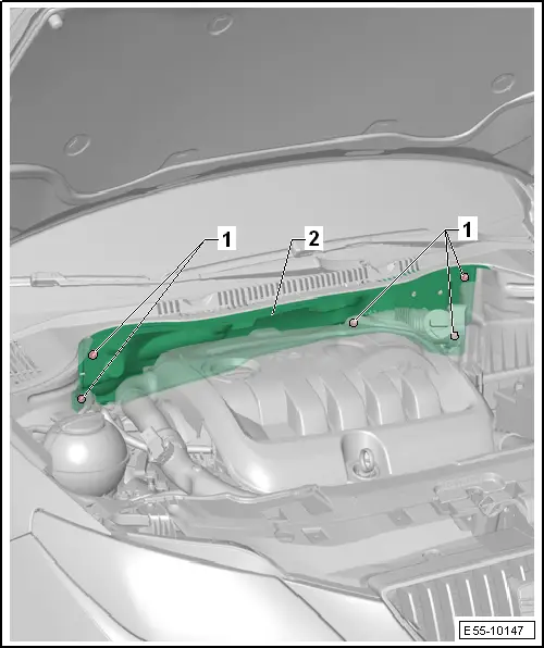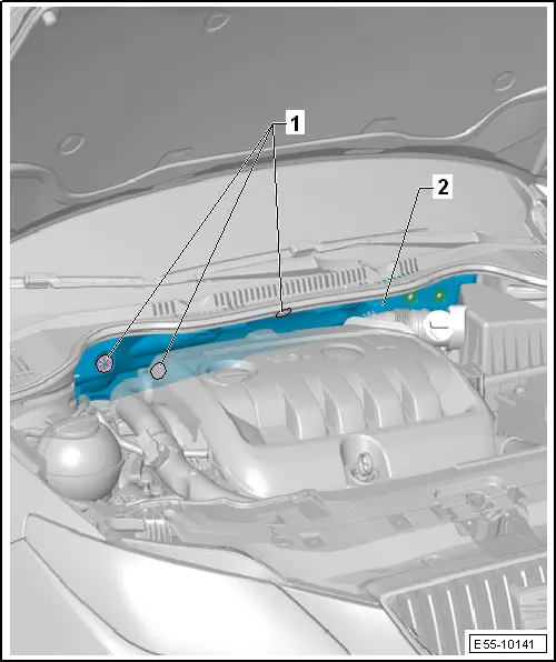 | – | Remove the grille below the windscreen -2-. Pay particular attention that the wiper arm shafts are free. |