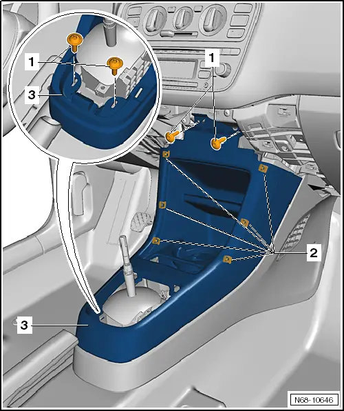 | – | Release centre console -3- from retaining clips -2- by pulling to rear. |