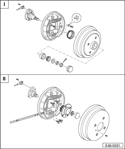 | I - | Rear brake fitting and removing (Vehicles with drum brakes up to 08.00) → Chapter. |