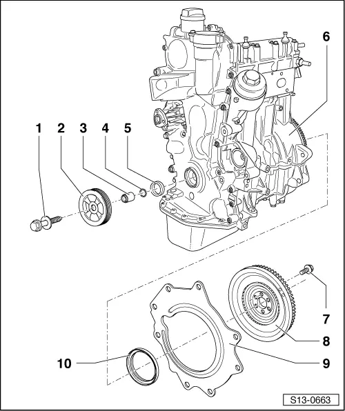 | q | Interlock crankshaft flywheel with a assembly device -T10121- for removing and installing it → Chapter |